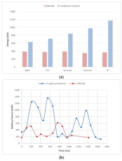 Performance of Energy Consumption. (a) Energy consumption of ENSURE and Traditional Method; (b) power versus time while searching keyword “Internet”.