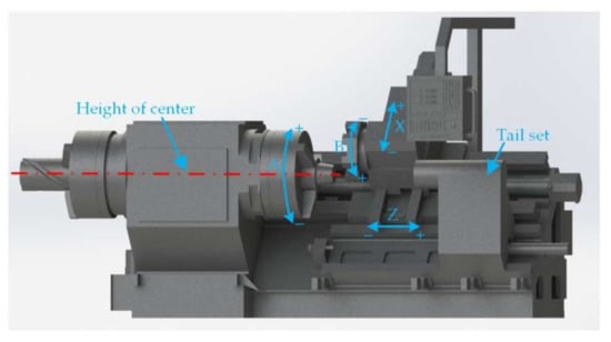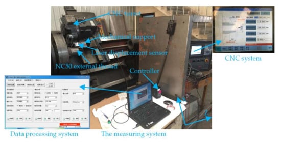 The actual structure of on-machine testing system is shown in Figure 3, which mainly includes the laser displacement sensor, controller, numerical control system, and data processing system. Among that, the data processing system is developed by Shenyang University of Technology, China, and named as the first version of the drill pipe thread data processing system. As the core of the whole system, the said system has the functions of testing parameters settings, data collection, error compensation, data reconstruction, and thread parameter calculation. Further, the system is installed in a computer equipped with Intel Core I7 processor, 3.8 GHz operation speed, and 8 GB memory, and the laser displacement sensor is manufactured by Keyence, Osaka Japan with the model of LKH080, with a specific measurement range from −18 mm to18 mm, resolution 0.1 μm, and linear error ±0.02% F.S. The testing process is specified as follows: set up testing parameters in the data processing system, such as the sensor sampling frequency, the tested thread model, the tested thread length, the testing speed, etc., and synchronize the said parameters to the numerical control system through RS232 serial port. The sensor with an external signal input is installed on the CNC tool saddle by racks. When the Z-axis ball screw-driven saddle controlled by servo motor moves according to the set speed, the Z-axis ball screw encoder connects the pulse signal of certain frequencies to the input, and the sensor synchronously outputs the tested analog data to the controller through Ethernet when triggered by the valid pulse edge. Further, the data is transmitted to the data processing system after A/D conversion in the controller. After the first sensor scanning, the data processing system obtains the X and Z coordinates of thread axial section, conducts compensation and reconstruction, computes the thread parameters required according to the extracted feature points, and judges the processing quality. The results are communicated to the numerical control system via RS232 serial port, and the unqualified workpiece is corrected by lathing according to the cutter compensation, with a result that the closed-loop process of the on-machine measurement is completed.