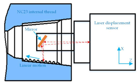 The research on various non-contact testing devices for thread parameters shows that all the testing devices take the axial section of thread as a testing object, and then calculate the mathematical relationship between the parameters of the thread to be measured and the tested contour. Therefore, it is the core task of this system to obtain certain axial section contours of the drill pipe thread. Figure 2 presents the principle of laser displacement sensor scanning. As the minimum internal thread of the measured drill pipe is NC23, the maximum diameter only 66.97 mm, and the sensor shell 100 mm in length, it is impossible to conduct internal measurement. As a result, the mirror board is used to assist the measurement. In the measurement process, the laser displacement sensor is scanned according to the thread taper degree; the active light source is reflected vertically by the mirror board to the thread; the laser beam is reflected back to the mirror board again through the diffuse reflection of the surface to be measured; the CCD (Charge Coupled Device) in the sensor receives the diffuse reflected light signal, which is refracted back by the mirror board; and, eventually, the thread axial section contour is obtained.