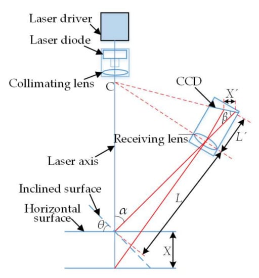 Based on the laser triangulation principle, a laser displacement sensor is mainly composed of laser driver, laser diode, collimating lens, imaging lens, photoelectric coupling surface CCD, and signal processing circuit. The basic principle is shown in Figure 4, in which X is the displacement of the measured object plane, X’ is the displacement of the light spot image on the CCD, α is the angle between the optical axis of imaging lens and the laser beam, β is the angle between the optical axis of imaging lens and the CCD plane, L is the object distance of imaging lens, and L’ is the image distance of imaging lens. According to the theorem of similar triangles, it can be concluded that: