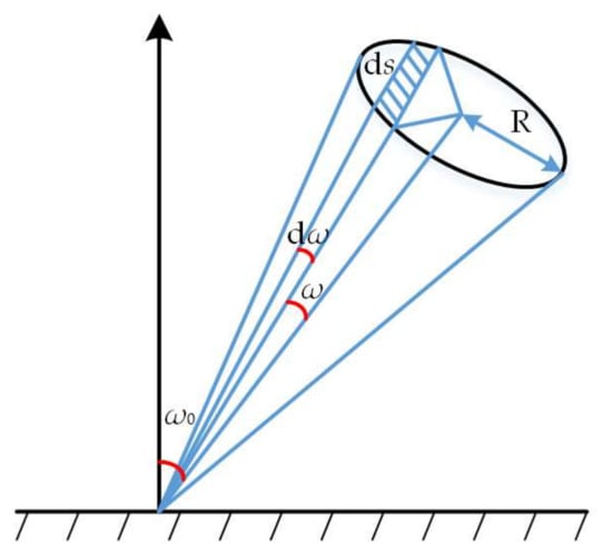 in which dσ is the solid angle of the surface to the incidence point, ω0 is the angle between the imaging lens axis and the normal of the measured object, and ω is the angle between the imaging lens axis and the surface boundary. According to the geometrical relationship of the receiving surface in Figure 6 and in combination with the Beer-Lambert Law, the light received by the imaging lens is