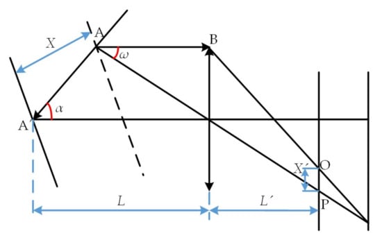 In the said paragraph, it is stated that in case of a measuring point inclination angle, the light centroid on the CCD relatively deviates from the geometric center of converged light spots, and the amount of deviation is the measuring point inclination error. Figure 7 gives a schematic diagram of the light spot centroid, in which the point P on the CCD is the centroid position of the centroid line AB through the refraction of imaging lens. According to the geometrical relationship shown in Figure 7, it can be reduced that the distance between the imaging point P of the light centroid line on the CCD and the imaging lens axis is