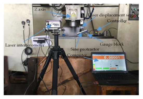The inclination error experiment is composed of a four-axis vertical machining center, a laser interferometer, a laser displacement sensor, a sine bar, and a computer. The laser interferometer is manufactured by Renishaw, London England with the model of XL-30, with the specific measuring range of 30 m, the resolution of 0.01 μm, and the measurement error of ±0.1 ppm. The parameters of the laser displacement sensor and computer are both given in the said paragraphs.