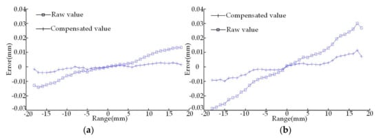 As the experimental process is shown in Figure 8, the optical path components of the sensor and the interferometer are installed on the Z-axis and work platform of the machining center; the sine bar is placed on the work platform right below the sensor, and it can be jacked a certain angle by a gauge block; the sensor readings are shown on the controller; and the interferometer readings are displayed on the computer. After the start of the experiment, when the sensor and the interferometer move each 1 mm within the range of the laser displacement sensor, their values are recorded respectively. As the half of thread angle of the drill pipe is 30°, the measuring point inclination angle in the flank is 60°. For purpose of the preparation of the subsequent thread measurement experiment on the basis of verifying the inclination error model, the sine bars with the inclination angles 20° and 60° are built, along with the inclination error compensation shown in Figure 9a,b.