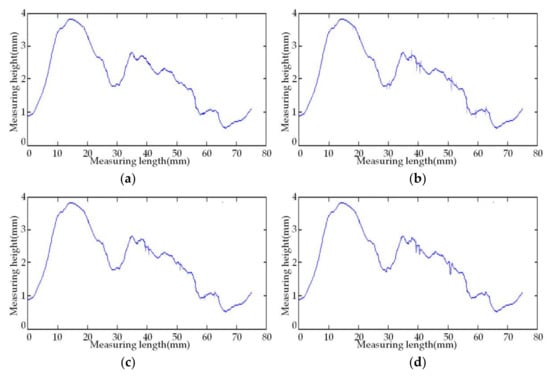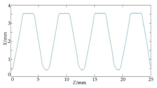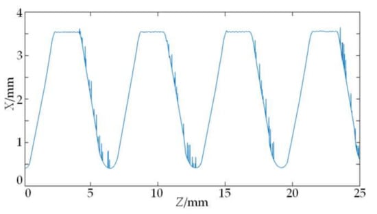 The on-machine measuring system for the parameters of the drill pipe thread designed in this paper is used to measure the parameters of the NC50 drill pipe thread lathed in SCK230 drill pipe thread repairing machine tool, and the scanned original data is shown in Figure 14. The contour of the thread axial section is expressed by the 2D discrete curve . Since the thread contour is a large inclined periodic surface, the original data of the flank should compensate for the inclination error. First, according to the degree of half of thread angle of the drill pipe, the inclination angles of two thread flanks relative to the horizontal plane can be known. Then, the theoretical distance between each sampling point on the thread surface and the laser displacement sensor is calculated from the number i of each data point, the interval of the trigger pulse, and the relative position of the laser displacement sensor to the thread surface. Finally, the said inclination degree and theoretical distance are put into Equation (7) to calculate the amount of inclination error compensation for each data point in the flank section. After the inclination error compensation is made for the curve, the wavelet denoising based on the improved threshold function is employed. The contour of NC50 thread axial section after denoising is shown in Figure 15, and it proves that the noises are obviously weakened after smoothness.