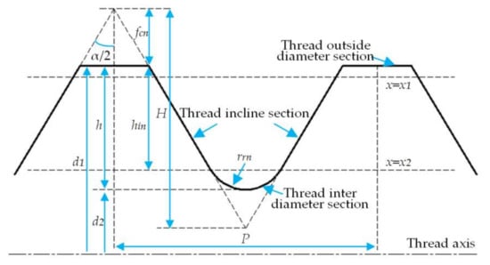 in which H is the original triangle height of thread profile, fcn is the depth of truncation of crest, rrn is the radius of rounded root, and α/2 is the half of thread angle. After taking the second dividing line x2 = xmax − hin and dividing the remaining data points, we can get r flank domains P2i (i = 1, 2,…, r) at the upper part of the dividing line x = x2 and s rounded root domains P3j (j = 1, 2,…,s) at the lower part of the dividing line x = x2.
