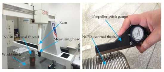 The drill pipe thread is mainly used for the connection between drill pipes in the oil and gas drilling industry, and it can transmit the great torque required by the drilling from the wellhead to the bottom hole bit [1]. As this taper thread bears great torque and high sealing requirements, its contour parameters should be highly accurate and conform to the standards of American Petroleum Institute (API) [2]. At present, the measurement of the contour parameters of the drill pipe thread is a contact type in the following two categories: (1) One category involves the measurement of the thread standoff by wrenching the thread gauge, which is the only method to judge whether the drill pipe thread processed is qualified by each oilfield service station. Though both the on-machine and off-machine measuring methods can be carried out in the said method, we can acquire only comprehensive parameters but cannot achieve the accuracy measurement of the contour parameters of the drill pipe thread and the crest and root profile. In addition, this measurement requires hard labor and is easily affected by human factors. (2) The other involves employing the monomial parameter gauge to measure all the parameters of the drill pipe thread other than the thread angle and pitch diameter. We can conduct an off-machine, random inspection of the drill pipe thread only in the laboratory, while the measurement of parameters of the internal thread is incomplete. In recent years, many scholars have devoted themselves to research of the non-contact measurement of the thread, achieving certain results [3,4,5]. However, such research is still carried out by the off-machine measuring method. Accordingly, repeated clamping processes of a drill pipe approximately 10 m in length and 300 kg in weight cost a multitude of auxiliary time, increase the positioning error of measurement, and make it impossible to ensure the accuracy of unqualified thread after correction.
