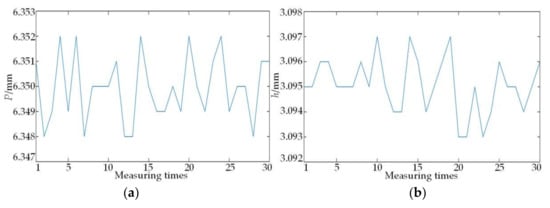 The repeatability tests show that the maximum deviation shown in the Figure 18 is 4 μm, and hence the repeatability limit of the on-machine measuring system ≤4 μm, and then according to Equation (21), S(p), and S(h) calculated based on 30 times of measurement are respectively 0.0013 and 0.0012. The same procedure is adopted to obtain the result that both the half of thread angle and taper have more than low experimental standard deviation. Accordingly, it can be concluded that the on-machine testing system has high repeatability of measurement.