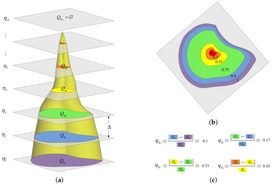 For a given intensity image, assume that its gray level range is ; N equal-interval thresholds of the gray level are set as , where means the interval and is the i-th threshold. For a certain threshold, if the gray level of the pixel in the image is smaller than the threshold, then the gray level of the pixel is set to zero; otherwise, it is set as one. In this way, we can get N binary images corresponding to the thresholds, and the region with a higher gray level in each binary image is called the extreme region. Specifically, the extreme region is a connected area corresponding to a certain gray level threshold, and the gray levels of all pixels in this area are larger than the threshold, while the gray levels outside this area are all smaller than the threshold. Then, a series of mutually extreme regions are generated, which are represented as in Figure 1.