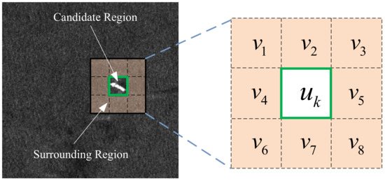 To take the local contrast characteristics of the candidate region into account, the surrounding regions for each candidate region should be constructed. Figure 2 shows the illustration of the local contrast calculation stencil. As shown in Figure 2, denotes the k-th candidate region obtained by the MSER method, and represents the surrounding regions corresponding to . Assuming the mean gray level of the j-th surrounding region is , it can be expressed as follows: