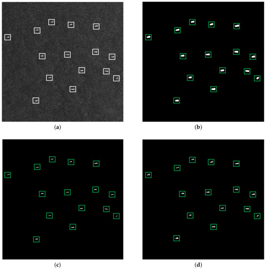 Figure 4 shows the detection results of the three methods under a homogeneous background. The original SAR image of the homogeneous scene is shown in Figure 4a, which contains 15 ships, labeled by white rectangles. Figure 4b–d demonstrate the detection results of the VWIE method, the CA-CFAR method and the proposed method, respectively, where the green rectangle means the correct detection. As the signal-to-clutter ratio (SCR) is high for a homogeneous scene, the three methods successfully detected the ship targets without false alarm and missing inspection.