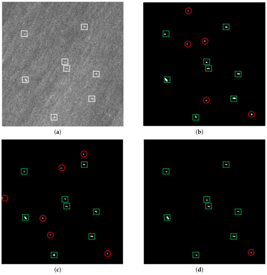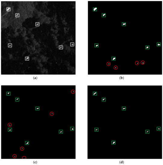 Detection results of the strong clutter scene: (a) original SAR image, (b) detection result of the VWIE method, (c) detection result of the CA-CFAR method and (d) detection result of the proposed method.