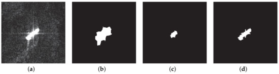 Figure 7 shows the detection results of one ship slice in the experiments. The original SAR image of the ship slice is shown in Figure 7a–d, giving corresponding detection results of the three detection methods, respectively. It can be seen from the results that the VWIE method makes the ship boundary broaden, and a shrinkage of the ship area has appeared in the -based CA-CFAR method. In contrast, the proposed method basically maintained the original boundary and area of the ship.
