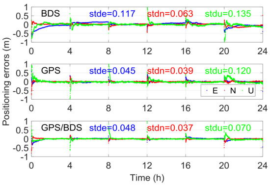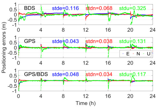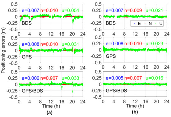Prior to evaluating the RZTD-constrained model, GPS, BDS, and GPS/BDS-combined data were processed with the traditional RTK model. Thus, the factors affecting the precision of BDS medium-long baseline RTK positioning were analyzed and compared with the GPS performance.