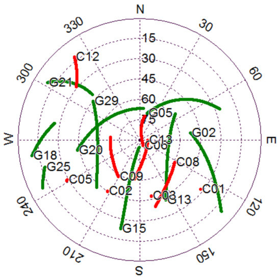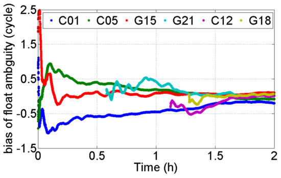 In principle, the geometric structure of GPS/BDS is considerably better than that of single GPS. However, a confused phenomenon is shown in Figure 2. That is, the precision of the height component for the GPS/BDS-combined situation was lower than that for the single GPS system in the initial period (e.g., sessions 1 and 6). In fact, the precision of float RTK positions will also be influenced by the precision of float ambiguities, particularly for satellites with a low elevation angle. Figure 6 shows the bias of float ambiguities for satellites with low elevation angle when the aforementioned baseline was solved using GPS/BDS data during this period. The biases of float solutions were determined by subtracting integer ambiguities from float solutions. The initialization time of BDS satellites C01 and C05 was considerably longer than that of the other satellites. Notably, C01 and C05 are GEO satellites with positions that remain nearly static with respect to ground stations. GEO satellites lack variation in geometric structure, hence ambiguity convergence time is considerably longer than that of satellites with other orbit types when the elevation angle is relatively close. Although the GEO satellites have some disadvantages regarding parameter initialization, the positioning performance will be improved after their ambiguities convergence.