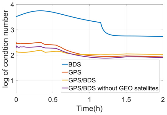 A precise float ambiguity is a prerequisite for a reliable AR. To a certain extent, the float RTK positioning solution can reflect the precision of float ambiguity and other correlated parameters. Figure 2 illustrates the traditional float RTK positioning results from six independent sessions on DOY016 solved with BDS, GPS, and GPS/BDS data. Due to space limitations, only the result of one baseline (here Baseline 6) is presented. As shown in the figure, the standard deviations (STDs) of the three baseline components for BDS RTK positioning were 0.116, 0.068, and 0.325 m, which are apparently higher than those for GPS (0.043, 0.038, and 0.131 m) and GPS/BDS (0.048, 0.034, and 0.117 m), particularly for the height direction. The height error of BDS for traditional RTK was over 0.5 m, even after 1 h of initialization in the first session. Figure 3 shows the satellite number and geometric dilution of precision (GDOP) values of the three situations for the first 2 h. Notably, the number of satellites for BDS is one or two more than that for GPS. However, the GDOP values of GPS are lower than those of BDS in most cases. As shown in Figure 4, the weak satellite geometric structure of BDS may be responsible for this result. The BDS satellites are more unevenly distributed than the GPS satellites. These two items are indicators of satellite geometric structure in a single epoch. The filter estimator captures the changes in satellite geometry and mapping functions over a certain period. This capability of the filter estimator enables us to distinguish the troposphere zenith delay from the height component. The condition numbers of BDS, GPS, and GPS/BDS scenarios were computed in the Kalman filter process. The condition number is defined by the ratio of maximal and minimal eigenvalues of the normal matrix for the estimates. This is a measure of how numerically well-conditioned or ill-conditioned a problem is [18,19]. As shown in Figure 5, with changes in satellite geometry, the condition number decreased over time and tended to become stable after a certain period. Simultaneously, the condition number of BDS was significantly higher than those of GPS and GPS/BDS-combined. The condition number of BDS was over , even after convergence, which is higher than the value of GPS for the first epoch. A high condition number means a serious ill-conditioned problem, and thus the height component is difficult to distinguish from the troposphere parameter. Consequently, the low precision of the height component for BDS appears reasonable due to the poor satellite geometric distribution and the ill-conditioned problem. In addition, it can be seen that the GPS condition numbers went below the GPS/BDS model in Figure 5 after a longer time-span filtering. Compared with condition number of GPS/BDS without GEO satellites, we can conclude that this is mainly attributable to the BDS GEO satellites. With GEO satellites, the ill-condition number can be alleviated in the initial period; however, the geometry of GEO satellites remains almost unchanged—they may even hinder the reduction of condition number as time goes by.