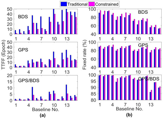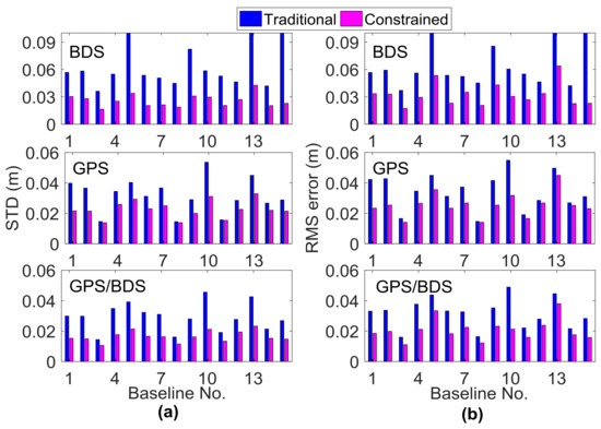 As shown in Figure 8, the effect of the external troposphere correction on the horizontal accuracy of RTK positioning was not apparent; thus, only the height component is shown in the following analysis. Figure 9 and Figure 10 illustrate the statistical results of TTFF, fixed rate, STD, and RMS errors in the vertical direction for all 15 baselines on DOY016. As introduced in Section 3.1, for each baseline, the TTFF was calculated using the results of 41 sessions; the remaining three indicators were calculated using six independent sessions, in order to avoid duplication of statistics. The reference coordinates were determined by the post-processing GAMIT software [40]. It can be seen that TTFF was accelerated when the GPT2-constrained model was used. Generally, BDS showed longer TTFF, and the TTFF of two baselines was even more than 50 epochs (30 s interval) for the traditional model; this may be due to the heterogeneous satellite distribution and long convergence time of the ambiguity parameter for GEO satellites. Compared to GPS and BDS, GPS/BDS showed great improvement in TTFF; the TTFF of 11 baselines was less than three epochs in the GPT2-constrainted model. In terms of ambiguity fixed rate, all 15 baselines improved using the GPT2-constrained model. For BDS, Baselines 7, 10, and 12 exhibited an improvement of 14.1%, 15.0%, and 9.3%, respectively; the average improvement was approximately 7.5%. However, only a slight improvement was observed for the GPS/BDS-constrained RTK model. Meanwhile, the fixing rate decreased as the baseline length became longer. A large residual atmospheric error—particularly for ionosphere delay—may account for such a result. In addition, the STD of the height component was reduced considerably. The height STDs of 11 baselines were reduced by over 50% for BDS, whereas the STDs of 10 baselines were reduced by over 40% for GPS/BDS. The STDs of the fixed results for three exceptional baselines were over 0.1 m. Incorrectly-fixed ambiguities for certain epochs were responsible for this situation. The correct integer ambiguities were judged by comparing the ambiguities derived from RTK mode with post-processing mode. The lengths of the two baselines were 138.9 km and 166.9 km, respectively. A long baseline will have a high probability of being incorrectly fixed, particularly for weak geometric structure conditions such as the BDS-only situation. In addition, the STD of Baseline 5 for BDS traditional RTK was also more than 0.1 m, which was similarly caused by incorrectly-fixed ambiguities for certain epochs. However, the STD became normal when the GPT2-constrained RTK model was used, indicating that external troposphere corrections were helpful in improving model strength and float ambiguity accuracy. The RMS error of the positioning results for the GPT2-constrained RTK model also decreased considerably compared with that for the traditional RTK model. The average performance improvement of height RMS error was 44.2% and 33.1% for BDS and GPS/BDS situations, respectively.