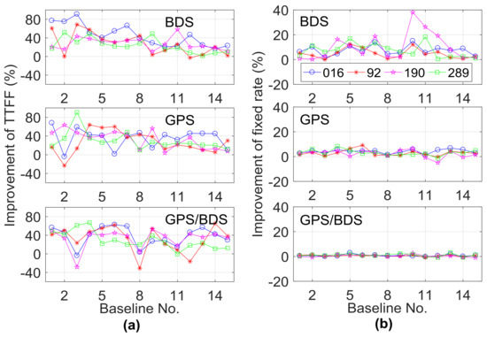 where is the number of sessions. In this study, the time span was set as 4 h for each session in order to acquire enough samples for calculating TTFF; data from 0:00:00–3:59:30, 0:30:00–4:29:30, 1:00:00–4:59:30,……, 20:00:00–23:59:30 were processed; and a total of 41 sessions were obtained for each baseline in one day—six of them independent sessions (0:00:00–3:59:30, 4:00:00–7:59:30,……, 20:00:00–23:59:30).