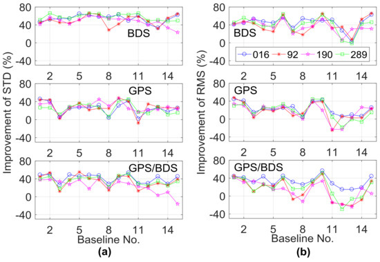 In terms of TTFF, comparing the results on DOY016, the performance of BDS decreased on the other three days, whereas the GPS and GPS/BDS-combined scenarios did not show apparent performance reduction. The performance of the fixed rate indicator showed a slight difference for the four days in different seasons. Compared to the results on DOY016, the performance of STD and RMS indicators on the other three days showed different levels of reduction for the GPS/BDS-combined scenario. Specifically, the performance reduction on DOY190 was most obvious. On DOY016, the average improvement of STD and RMS indicators for the 15 baselines was 41.3% and 33.1% for the GPS/BDS-combined scenario, while the corresponding values were 24.0% and 12.1% on DOY190. The atmospheric circumstance varies greatly in the summer, the precision of the empirical GPT2 model becomes uncertain, and the performance of the RZTD constrained model may also be reduced. Compared to the GPS/BDS-combined situation, only slight performance reduction was observed in the BDS-only scenario for these two indicators on DOY190. The satellite geometry structure of the BDS-only scenario was weak; with the external constraint, the performance could be greatly improved even in relatively tricky tropospheric conditions. Meanwhile, compared to STD, the performance of the RMS indicator showed a larger reduction; for example, on DOY190, the improvement of the STD indicator for Baselines 11–13 was positive for the GPS/BDS-combined situation, whereas the improvement of the RMS indicator became negative for these three baselines. It should be noted that the length of these three baselines was more than 100 km. The a priori RZTD corrections have larger uncertainty when the baseline is longer and the external troposphere constraint may result in position bias. In this case, the variance of a priori RZTD information also matters, which will be discussed in the next section. In general, the GPT2-constrained model can improve the performance of medium-long RTK in different tropospheric conditions. For BDS, the average performance improvement of TTFF, fixed rate, STD, and RMS for the four days were 30.9%, 7.5%, 52.4%, and 40.0%, respectively. The corresponding values for the GPS/BDS-combined scenario were 33.0%, 0.7%, 34.0%, and 19.8%.