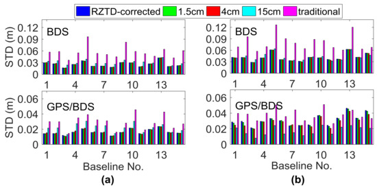 The data collected on DOY016 and 190 for all 15 baselines were processed using the GPT2-constrained RTK model with different STD for the a priori GPT2 tropospheric corrections. Figure 13 shows the vertical STDs of the fixed RTK solution for BDS-only and GPS/BDS-combined scenarios when for external RZTD information in Equation (5) was set as 1.5, 4.0, and 15 cm, respectively. The statistical results only included the correctly fixed solution. The traditional RTK model can be regarded as the RZTD-constrained RTK model when is set as for GPT2 troposphere information. In addition, without estimating the RZTD parameter, the method correcting the troposphere error in phase and pseudo-range observations with the GPT2 model was also used for comparison. This method is also called the ZTD-corrected model, which can be regarded as the RZTD-constrained model when is set infinitely close to zero. Compared to the BDS-only situation, GPS/BDS-combined RTK seems to be more sensitive to the value of . In two different tropospheric conditions, compared to traditional RTK, the STDs of the BDS-constrained RTK solution greatly decreased when was set between 1.5 cm and 15 cm; however, the performance of the GPS/BDS-combined GPT2-constrained RTK varied greatly with different . Additionally, it can be seen that on DOY016, for most baselines, the STD of the positioning results increased for both BDS-only and GPS/BDS-combined scenarios when the value of increased, and the RZTD-corrected model obtained a preferable effect on this day. However, on DOY190, the STD of the BDS-only fixed solution for Baselines 11, 12, 14, and 15 did not increase as the value of increased; the STD of the GPS/BDS-combined RTK for most baselines greatly decreased when the value of varied from 1.5 cm to 15 cm, and the performance of the RZTD-corrected model was the worst for the GPS/BDS-combined situation on this day. This means that for relatively stable tropospheric conditions on a winter day, a smaller value seems preferable. However, on a summer day, a higher value is helpful to decrease possible introduced bias. In general, to ensure the reliability of the RZTD constrained model, a relatively larger variance is usually proposed.