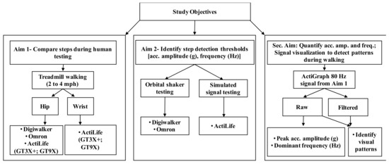 Thus, Aim 1 of our study compared manually-counted steps during treadmill walking to those from the hip-worn Digiwalker SW200 and Omron HJ720ITC, and steps from hip and wrist-worn GT3X+ and GT9X monitors processed using ActiLife software. Aim 2 determined device-specific raw acceleration amplitude (g-value) and/or frequency (Hz) thresholds to record steps. Results of Aim 2 may explain likely differences in step outputs among devices in Aim 1. A secondary aim of our study was to quantify features of high-resolution acceleration signals detected at the hip and the wrist and identify/describe visually distinctive patterns in the signals during walking. Such findings may further explain variability in output from Aim 1 and inform the development of superior non-proprietary step-detection methods when using accelerometer-based step-counters.
