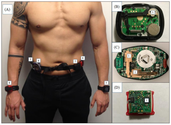 Participant with the ActiGraph GT3X+ (#6), GT9X (#3), the Omron HJ720ITC (#4), and the Digiwalker SW300 (#5). Figures (B–D) depict the sensing elements (#1) inside the three devices.