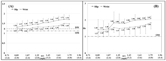 Overall, peak acceleration and the dominant signal frequency at the hip and wrist increased with speed (Figure 3A,B). Supplementary Table S1 contains values for the 2nd dominant frequency of hip and wrist movement (Figure 3).