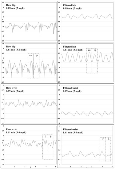 y-axis acceleration (5 s; 80 Hz) from a hip and wrist GT9X on a single participant and their corresponding bandpass filtered signals (0.25-2.5 Hz) processed using a fourth-order Butterworth filter. Dotted boxes indicate the same steps in the raw and filtered signals. ‘co’= contralateral step (step taken by the leg on the same side as the hip-worn device); ‘ip’= ipsilateral step (step taken by the leg on the opposite side as the hip-worn device); ‘f’= forward arm swing; ‘b’= backward arm swing.