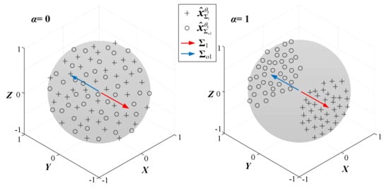 The α values are determined by the degree of power imbalances between different channels of a multivariate signal. In the 5th step of detailed procedures of APIT-MEMD, α = 0 denotes that there are no accountable power imbalances; conversely, α = 1 denotes high power imbalances between various channels. The illustration of α is shown in Figure 1. For the situation with power imbalances between channels in multivariate signal processing in practical situations, APIT-MEMD is very suitable for dealing with the sampling of multivariate signal. The adaptive projection strategy would generate much more adaptive projection vectors, thus exhibiting better performance.