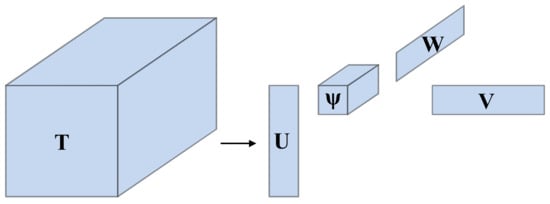The HOSVD is an extension of SVD. HOSVD conducts Tucker decomposition towards constructed third order tensors, then finds its core tensor and conducts an SVD on all mode products separately [38]. N dimensional data can construct Nth order tensors that have N indices. A third tensor constructed by IMFs matrices is analyzed in this paper as an example. A third order tensor can be decomposed by Tucker decomposition as follows: