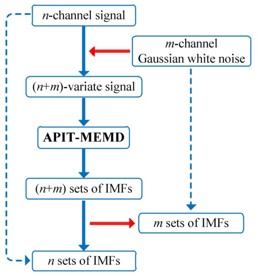 As for multi-fault diagnoses of multivariate rolling bearing signals, the filter bank property of APIT-MEMD in the presence of Gaussian white noise is discussed hereafter in this paper. In previous research, MEMD has been verified as having the properties of a dyadic filter bank on per channel of multivariate signals, and can arrange corresponding IMFs from various channels to the same frequency ranges. The obtained filtered IMFs represent the same frequencies, present in the same orders. The filter bank property of APIT-MEMD, in the presence of Gaussian white noise, is crucial for multivariate signal analysis. The extra noise channels can serve as references to enable more accurate and stable IMFs, which can also alleviate mode mixing problem. A graphical illustration of employing the filter bank property will be given in 2.3, along with the graphical illustration of the proposed multi-fault diagnosis scheme, in order to better explain the entire approach. The properties of APIT-MEMD will be discussed and verified by numerical simulations, including comparison with MEMD in Section 3. The procedures of proposed APIT-MEMD are given in Table 2.