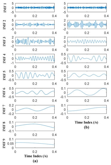 (a) Time domain plots of IMFs of EMD; (b) Time domain plots of IMFs of EEMD.