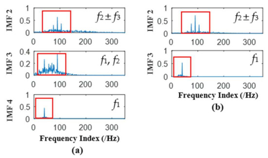 (a) Frequency domain plots of IMFs of EMD; (b) Frequency domain plots of IMFs of EEMD.