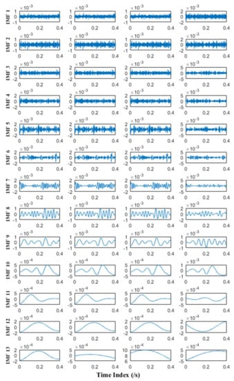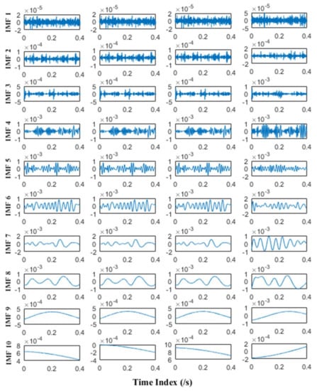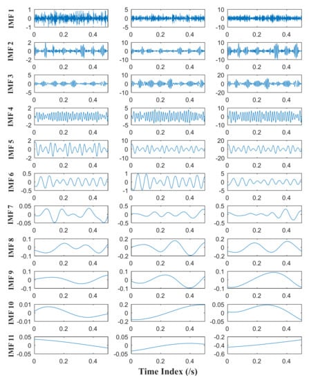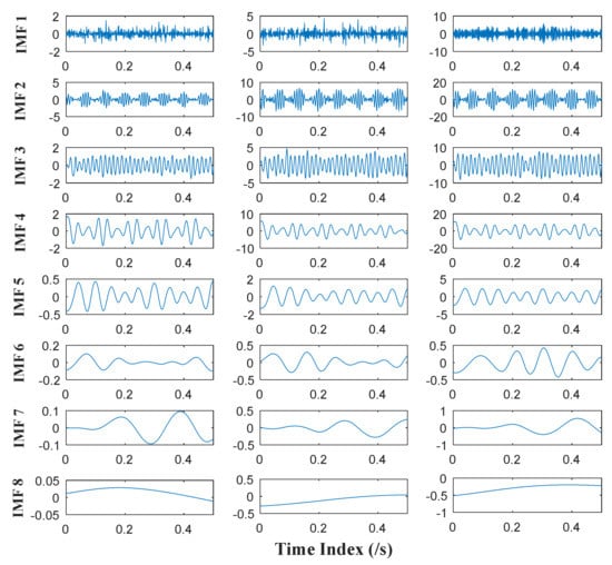 Prior to conducting MEMD and APIT-MEMD, the NLM denoising method is used to denoise the multivariate signal for preprocessing. The NLM method has been studied in previous research by the authors [47]. MEMD and APIT-MEMD were then conducted respectively on the above multivariate signal. In APIT-MEMD, α was chosen as 0.5, and two-channel Gaussian white noise with same length were added to the multivariate signal to employ the filter bank property of APIT-MEMD. Afterwards, two sets of IMFs corresponding to two-channel Gaussian white noise were discarded from the whole sets. The time domain plots of obtained IMFs of MEMD and APIT-MEMD are shown in Figure 17 and Figure 18 respectively.