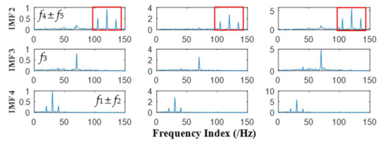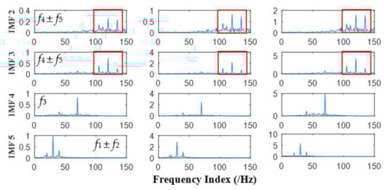 It can be seen from Figure 6 that 9 orders of IMFs are obtained by EMD, while 7 orders of IMFs are obtained by EEMD. Obviously EEMD can generate fewer orders of IMFs than EMD. Further, to measure the effectiveness of EEMD in alleviating mode mixing problem, during extraction of accurate characteristic frequencies of the simulated signal, correlation analysis is employed. The correlation analysis can be used to find effective IMFs; a similar method was elaborated in author’s previous research [27]. During correlation analyses, the 2nd, 3rd and 4th IMFs of EMD are effective, while 2nd and 3rd IMFs of EEMD are effective. The frequency domain plots of effective IMFs of EMD and EEMD are shown in Figure 7.