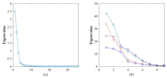 (a) Eigenvalues obtained by HOSVD; (b) Four sets of eigenvalues obtained by SVD.