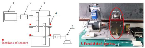 The schematic diagram and the picture of the experimental apparatus. 1-Variable speed drive, 2-Torque transducer and encoder, 3-Parallel shaft gearbox, 4-Test points, 5-Programmable magnetic brake.