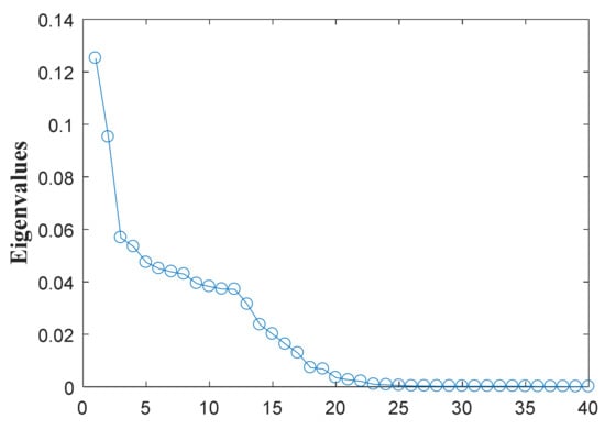 where fb1 = 20 Hz, fb2 = 70 Hz, fb3 = 150 Hz, fr1 = 10 Hz, fr2 = 8 Hz, fr3 = 10 Hz. Then after conducting APIT-MEMD, four IMF groups can be obtained. Then, all IMF groups are aligned according to the scheme in Figure 5 in Section 2.3, in order to construct third order tensor T. Here a comparison of SVD and HOSVD is given to elaborate the effectiveness of the proposed method. Based on traditional methods, SVD is conducted on the covariance matrix of transposed matrix composed of each IMF group. HOSVD is then conducted on the third order tensor T. The eigenvalues obtained from HOSVD and SVD are shown in Figure 13. 36 eigenvalues are obtained by HOSVD, and four sets of eigenvalues are obtained by SVD; each set has 9 eigenvalues.