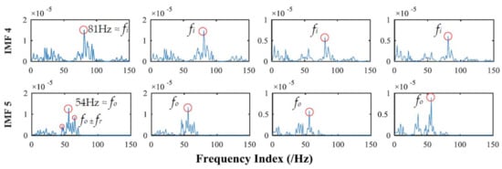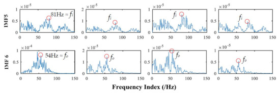 In the field of multi-fault diagnosis of rolling bearings, fault feature extraction is more complicated than single fault situations. Hence, mode mixing problems are more serious than single fault diagnoses. In this paper, the multivariate signal was collected (rather than that of a single channel), so power imbalance between channels was inevitable. So theoretically, APIT-MEMD would extract more accurate characteristic frequencies than MEMD. In the process of obtaining frequency domain plots, the frequency resolution equals the result of sampling frequency divided by sampling point, thus the frequency resolution in this paper is 1 Hz. Faulty frequencies of rolling bearings are obtained by empirical computing equations [27] for bearing fault frequencies, so the extracted frequencies cannot be precisely 81.45 Hz and 53.58 Hz. Therefore, the extracted 81 Hz and 54 Hz can respectively represent the inner ring fault and outer ring fault characteristic frequencies fi and fo in this paper. It can be seen from Figure 20 that the fault frequencies of both the inner and outer race faults cannot be extracted accurately by MEMD, as fi and fo tend to be overwhelmed by other noise frequencies. While in Figure 21, the fault frequencies of both inner and outer race faults were extracted clearly. In the 5th order of effective IMFs of APIT-MEMD, side frequencies fo ± fr can also be identified. Therefore, the effectiveness of the proposed multi-fault diagnoses of multivariate rolling bearing signal via APIT-MEMD and HOSVD has been verified by practical application.