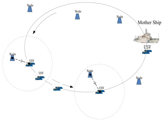 In order to save energy and complete the long-term underwater monitoring tasks, we implement the method of USV mobile collecting nodes data instead of the method of inter-nodes underwater acoustic communication, as shown in Figure 1.