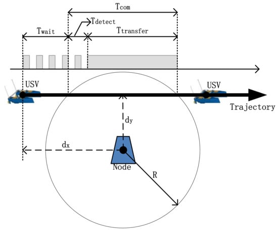Figure 2 shows that the USV travels at a constant speed through the communication range of node and the navigation trajectory can be approximated by the vertical distance of centered on the node. The communication process can be roughly divided into a detection phase and transmission phase. At the time of data collection, the USV periodically sends a wake-up signal, and the nodes’ mode is between the sleep mode and the detection mode. When the node detects the USV in the communication range, it converts to the transmission phase, and the transmission mode is fully open-designed.