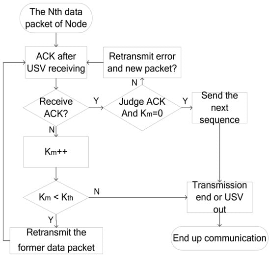 As shown in Figure 4, the USV converts to the receiving mode. Instead of sending the wake-up signal, the USV responds to the ACK signal after receiving the node packet. The point-to-point communication between the node and the USV uses a stop-and-wait ARQ transmission mechanism. The nodes send data sequence including packets. The duration of each packet is fixed, and is the same for the USV and nodes, which is known as the window size. After the node sends the packet, it will wait for the ACK signal response of the USV, and the ACK signal encapsulates the information whether or not the packet is transmitted correctly. The ACK signal duration is . If the node does not receive an ACK signal from the USV in , the data sequence will be resent and will be incremented by one. If it receives an ACK signal from the USV again, resets to 0. When reaches the threshold value, the USV is already out of the node communication range or the data transfer is completed, hence ending the transmission phase.