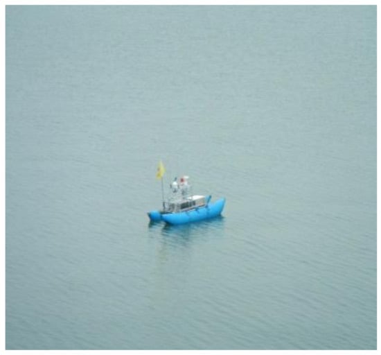 The lake experiment was carried out for the underwater acoustic communication at the JiHongTan reservoir in Qingdao on 15 July 2015 (Figure 5). The circumference of the reservoir is about 14 km, and the mean depth is about 10 m. A pair of EvoLogics underwater acoustic modems are used in the experiment, where one modem is set underwater 2 m at the shore, and the other is carried on the USV platform as a mobile node at a depth of 3 m. Additionally, an icListen hydrophone is installed at a depth of 1 m on the USV, which monitors communication signals with a sampling frequency of 256 kHz.