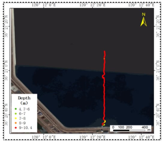 In order to verify the mobile underwater acoustic communication ability of the USV, the desired trajectory is set as a straight line in the north direction, with the starting point 36°20′35″ N, 120°12′25″ E and the end point 36°21′12″ N, 120°12′25″ E. Using the autonomous control of the USV, the expected line is followed automatically for 1 km, which can seen in Figure 6.