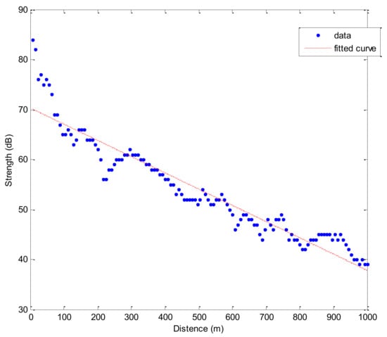 As shown in Figure 7, the blue star indicates the signal strength and the red line is the fitted curve. The communication abilities between communications nodes become weaker when the communication distance increases. In the experiment, the maximum communication distance is 1.9 km. In order to guarantee the success rate of data transmission, the communication radius is set as 1 km in the following protocol simulation. In sparse underwater monitoring networks, USVs communicate with the neighboring nodes point-to-point with no packet collisions. However, as a result of the unstable underwater acoustic communication channel, there may be packet errors, which can lead to packets retransmission between nodes, and affect the lifespan of the sparse network. In Figure 8, the packet error rate is averaged by 53 sets of data, and it increases with the communication distance. So, the greater the distance between the node and the USV, the greater the number of retransmissions and the energy consumed. When the distance is 200 m, the packet loss rate suddenly increases, which corresponds to the sudden decrease of the signal strength in Figure 7. The change of packet error rate with distance is used to support the simulation in the detection phase and transmission phase.