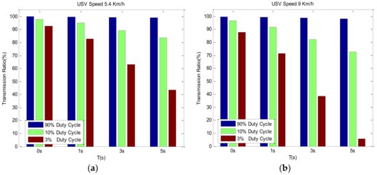 In Figure 9a,b, different USVs’ wake-up signal cycles and transmission ratios in different protocols are shown with the speed of the USV is 5.4 km/h and 9 km/h, respectively. The larger the ratio of the agreement, the greater the transmission ratio. Additionally, the effective communication time between the USV and nodes is increased, which means the node can detect the USV in its communication range in time. During the detection phase, the main factors that influence are and . Comparing Figure 9a,b, it can be seen that the smaller the USV’s speed is, the greater is, which means the USV is slower, and the node can detect USV more easily in time under the same conditions. In Figure 9a, even when s and the duty cycle is , it can still reach 43%, indicating that when the USV’s speed is 5.4 km/h, the node can effectively send the monitoring data with a lower energy consumption.