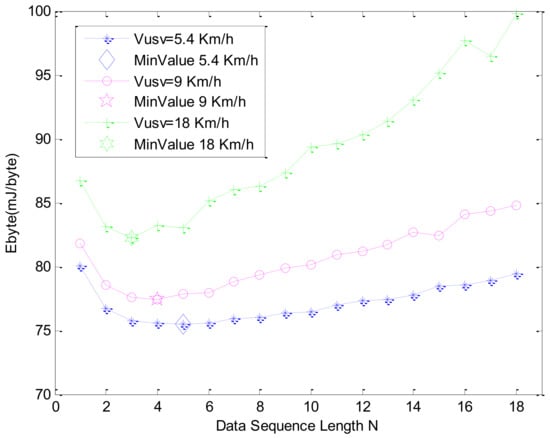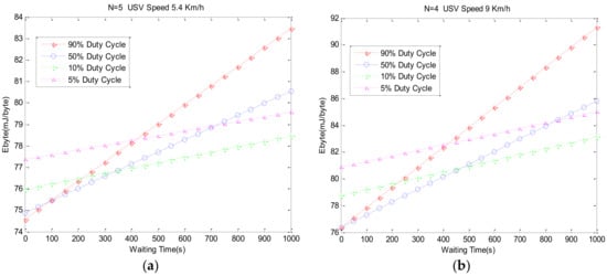 In the simulations, a different combination of parameters for minimizing energy consumption can be chosen according to the actual needs. For example, the velocity of the USV is usually low in the poor sea conditions, and a higher data sequence length and lower duty cycle should be considered.