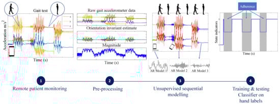 In recent years, sensors embedded in smartphones and wearable devices have become ubiquitous and have evolved to the point where they can be used in areas such as healthcare [,], environmental monitoring [,] and transport []. In healthcare, for example, smartphone sensors have been successful at detecting the symptoms of neurological disorders such as Parkinson’s disease (PD)  []. Through a smartphone application, on-board sensors in the smartphone capture the behavior of the user while they carry out a simple clinimetric (the science of measuring symptoms through quantitative instruments) test protocol, such as walking in a straight line with the smartphone in their pocket [], to detect the key symptoms of the disease. Collecting objective symptom measurements with clinimetric testing performed on technologies such as smartphones [,] or portable and wearable devices such as smartwatches [] and wearable IMUs [,] eliminates much of the subjective bias of clinical expert symptom measurement, while also allowing for remote, long-term monitoring of patient health []; in contrast to the current “snapshot” in time obtained during a clinical visit. Thus, remote, long-term monitoring allows for improved analysis of a patient’s health and outcomes. Usually, data from such sensors are collected and analysed under a set of clinimetric test protocol assumptions, such as the type of behavior to be carried out to probe for specific symptoms. Getting the assumptions of a test protocol to hold outside controlled lab settings is a universal problem, since uncontrollable confounding factors in the environment, such as unexpected behaviors, can have an adverse impact on the measurement process.