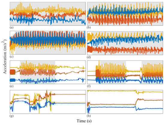 Illustrative examples of walking clinimetric test sensor data recorded using a smartphone accelerometer from healthy individuals and those with PD. Left column: walking tests from PD patients, right column: healthy individuals. The horizontal axis represents time in seconds (approximately 30 s) and the vertical axis (orange, red and blue) three-axis acceleration (m/s). Grey shaded areas: data segments in which the user is hand-labeled as adhering to the test protocol. (a) PD patient walking throughout the test; (b) healthy individual walking throughout the test; (c)  smartphone buzzer inn the first few seconds of the test, PD patient walking throughout the test; (d)  buzzer recorded in the first few seconds of the test, healthy individual walking throughout the test; (e) buzzer recorded in the first few seconds of the test; the PD patient deviates from the test protocol before adhering to the test instructions by starting to walk, near the end of the test; the PD patient deviates from the test protocol; (f) buzzer captured in the first few seconds of the test; the healthy individual then begins walking, after which the individual deviates from the test protocol and resumes walking near the end of the test; (g,h) the PD patient and healthy individual both deviate from the test instructions throughout the test.