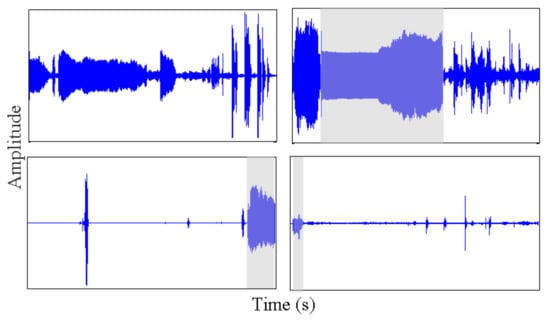 Illustrative examples of voice clinimetric test sensor data recorded using a smartphone microphone from healthy individuals and those with PD. The top two tests are performed by healthy individuals and the bottom two by PD patients. Voice tests take approximately 20 s, and the shaded area marks the part of the test where the user adheres to the test protocol.